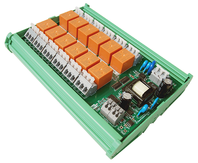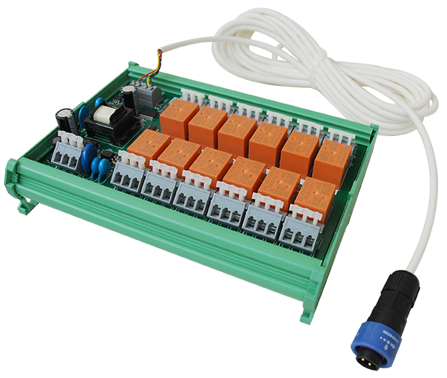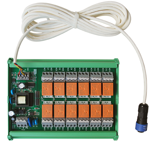 This satellite with 12exit can be connected to the Smartgrowcontroller and occupies only 1 sensor exit. It appears a new satellite which 12exit can be programmed individual through the SGC. A power LED indicates the state of the device and 12pcs signal LED show the actual switch-condition of the relay. Each relay can be powered at his own, dry contact carry max 10A (3A inductive) 230V (2'300W). All terminals are equipped with quick fastener (push to connect).